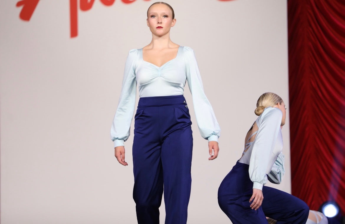 Light blue leotard with navy blue pants from The LineUp. All sales are final.