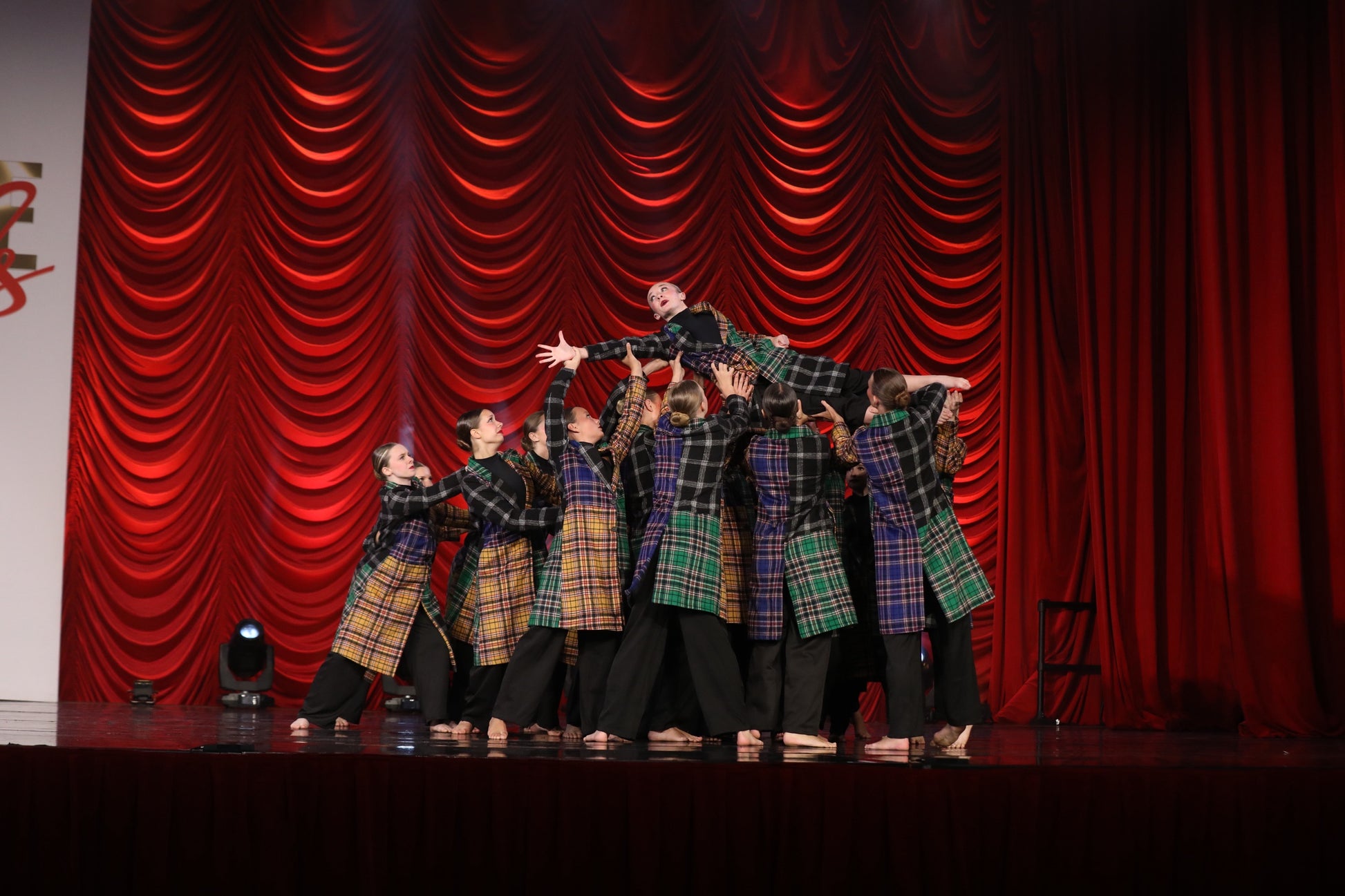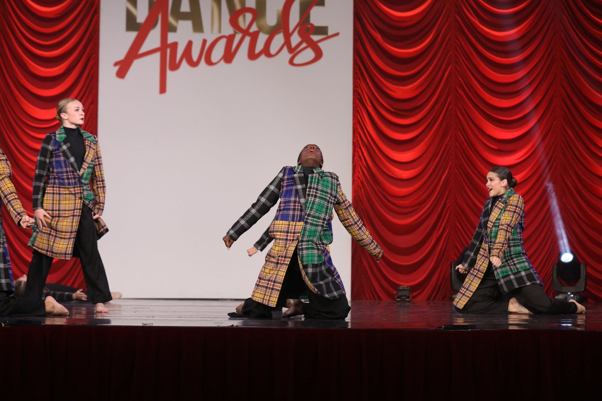 Plaid Coat with black pants and black leo.