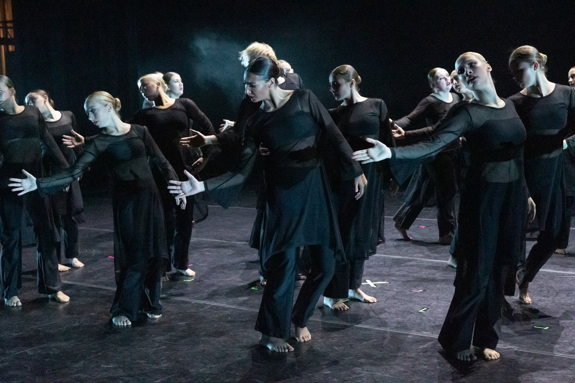Black pants, bra and sheer black tunic from Artistic Dance Designs. All sales are final.